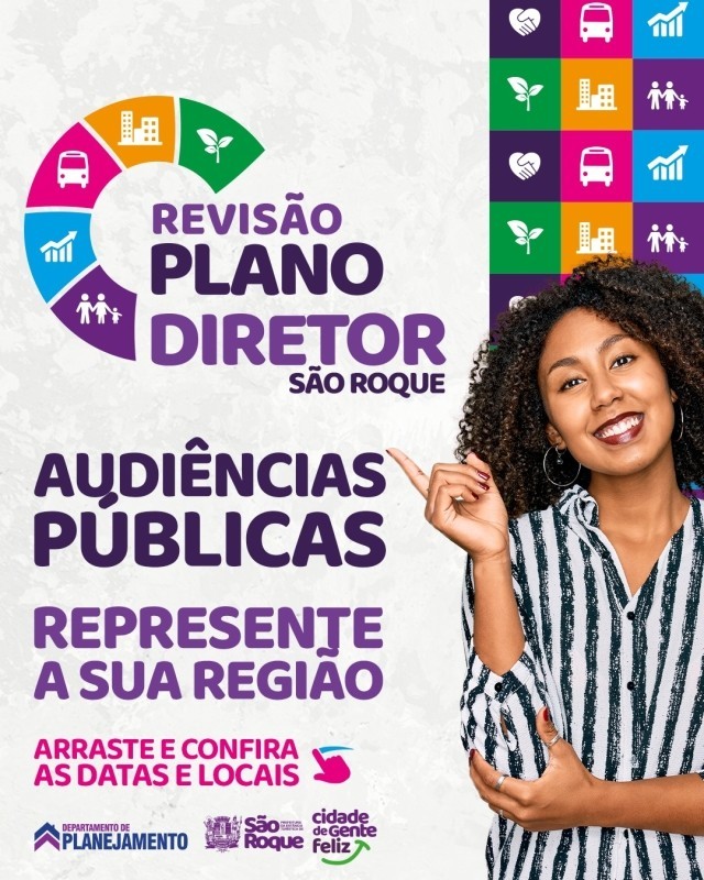 A Prefeitura de São Roque, por meio do Departamento de Planejamento e Meio Ambiente, definiu as datas e os locais das audiências públicas referentes à Revisão do Plano Diretor Municipal. Ao todo, serão realizados seis encontros abertos ao público, distribuídos em diferentes regiões da cidade, com o objetivo de ampliar a participação popular e garantir que o maior número possível de munícipes possa acompanhar e contribuir com esse importante processo.