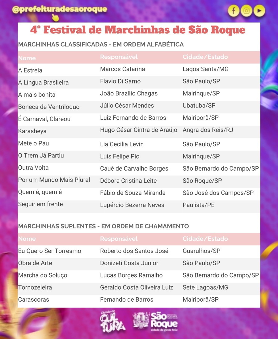 Nesta edição, o festival contará com marchinhas interpretadas por artistas de São Roque, de cidades da região e também de outros estados, como Mairinque (SP), Lagoa Santa (MG), Angra dos Reis (RJ), Paulista (SE), entre outros, reforçando o alcance e a importância do evento no cenário cultural.