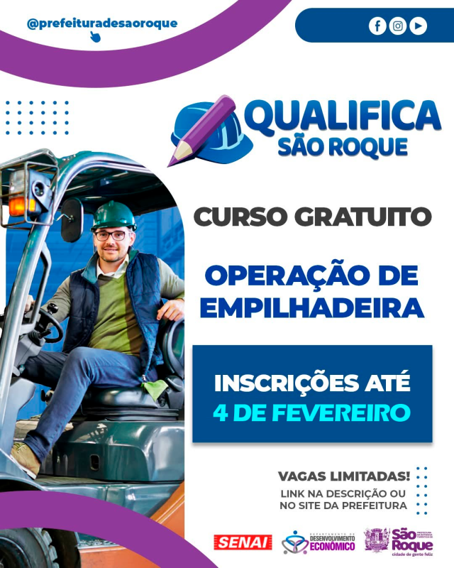 O Qualifica São Roque, maior programa de qualificação profissional da história do município, segue ampliando as oportunidades de capacitação para a população e inicia, a partir do dia 28 de janeiro, a divulgação de um novo curso: Operador de Empilhadeira. A formação é realizada em parceria com o SENAI e tem como objetivo preparar profissionais para atuação no setor produtivo, com foco em segurança, qualidade e produtividade.