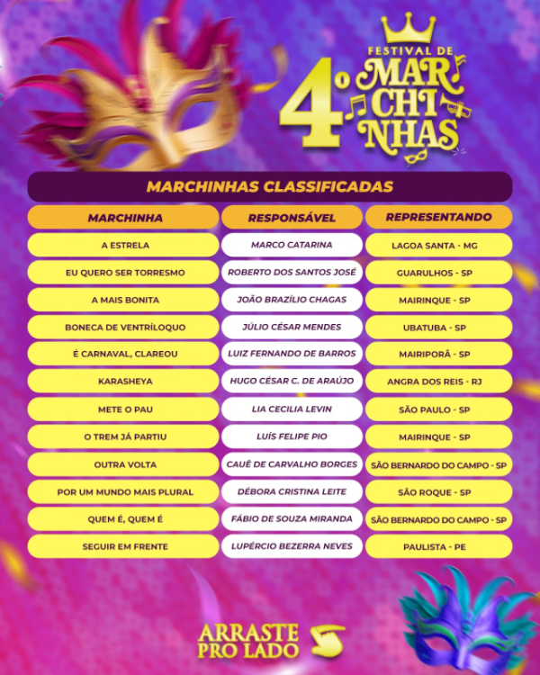 O 4º Festival de Marchinhas de São Roque registrou expressiva participação, com um total de 30 canções inscritas de diversos estados do país, reforçando a importância do evento para o calendário cultural do município e o interesse pela valorização e preservação das tradições carnavalescas da cidade de São Roque, como as marchinhas e os bailes de carnaval.