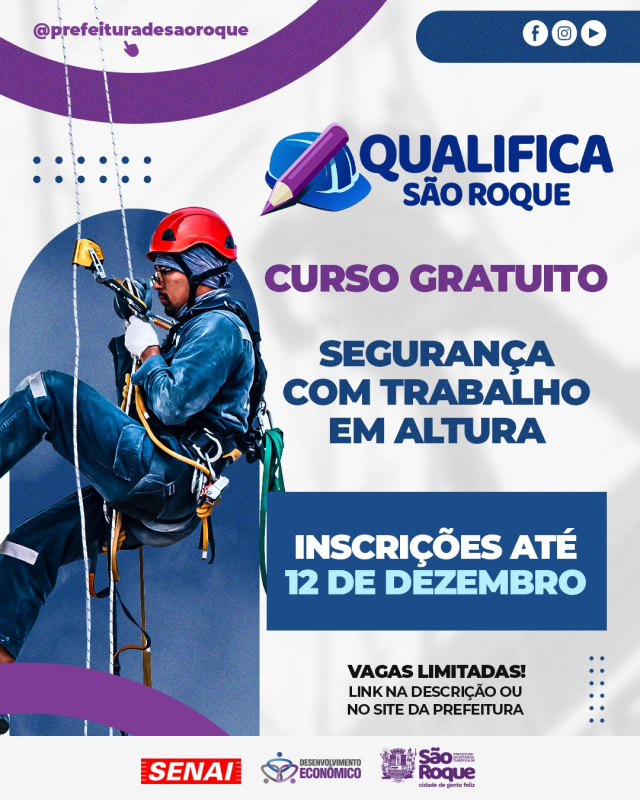 O maior programa de qualificação profissional da história de São Roque segue oferecendo novas oportunidades gratuitas para a população. Estão abertas as inscrições para o curso NR 35 – Segurança nas Atividades com Trabalho em Altura Inicial.